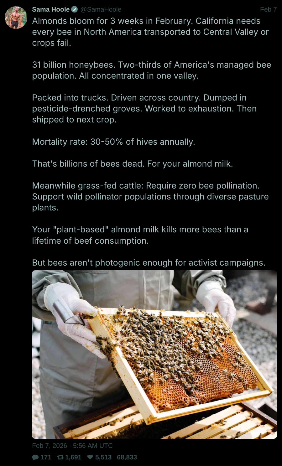The beef comparison is silly, while cattlemen are some of the best of the bunch faint praise, none of them mind doing the same poisonous shit to corn and other crops and shoving them in shitpile feedlots.