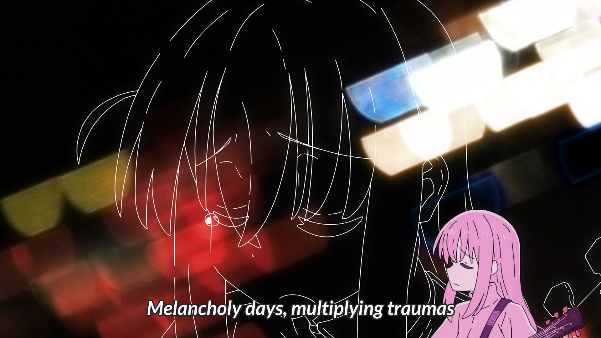 >Yearning to make friends and perform live with a band, lonely and socially anxious Hitori "Bocchi" Gotou devotes her time to playing the guitar. On a fateful day, Bocchi meets the outgoing drummer Nijika Ijichi, who invites her to join Kessoku Band when their guitarist, Ikuyo Kita, flees before their first show. Soon after, Bocchi meets her final bandmate—the cool bassist Ryou Yamada.